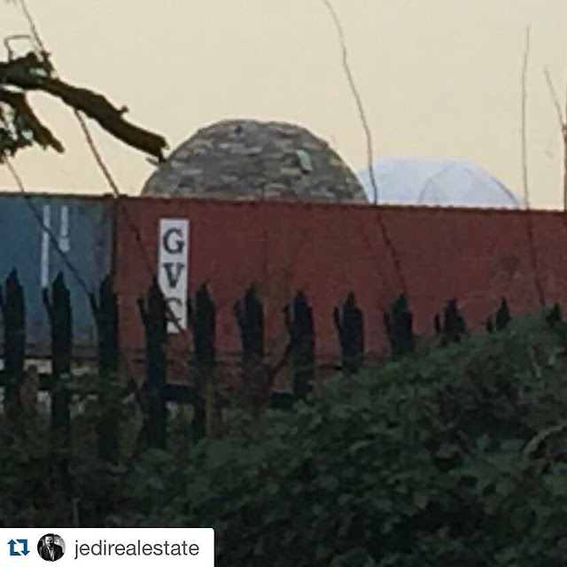 Star Wars Episode VIII production is in full swing, with principal photography now under way. The only planet from previous films that we know we will be returning to is Ach-To, the island planet where Rey found Luke at the end of Episode VIII. We saw in the production announcement teaser that production had already returned to Skellig Michael, where the scenes from The Force Awakens were shot, and it looks like we can expect to see a lot more of the planet in Episode VIII. However, due to environmental restrictions about shooting at Skellig Michael, there have been reports that locations on the island were being recreated on the back lot at Pinewood Studios. The Instagram account JediRealEstate posted a picture from outside Pinewood Studios that seems to show the Ach-To set. Check it out below,
